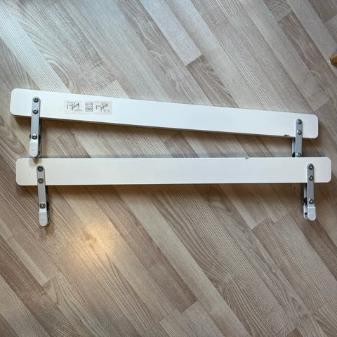 IKEA Tilbehør barneseng, består av to hvite sidestykker som kan festes på barneseng for ekstra sikkerhet. Passer til barnesenger fra IKEA, designet for å forhindre at barnet faller ut av sengen.