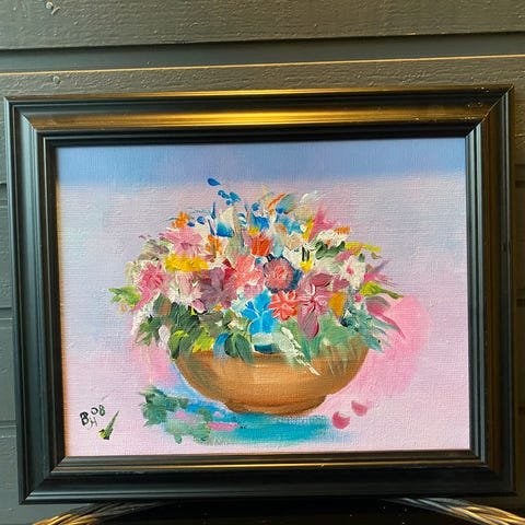 Maleri med motiv av en stor rose i rosa og gråtoner. Kunstverket viser detaljerte kronblader og noen blader rundt rosen. Passer til dekorasjon i hjem eller kontor.