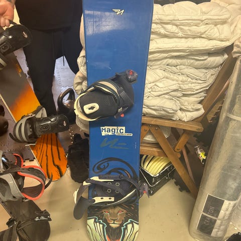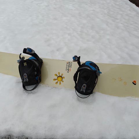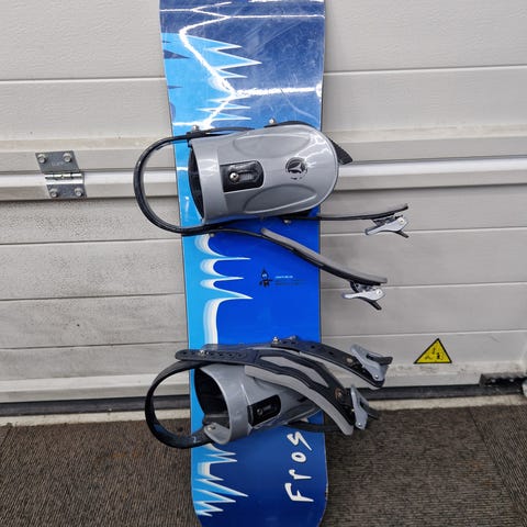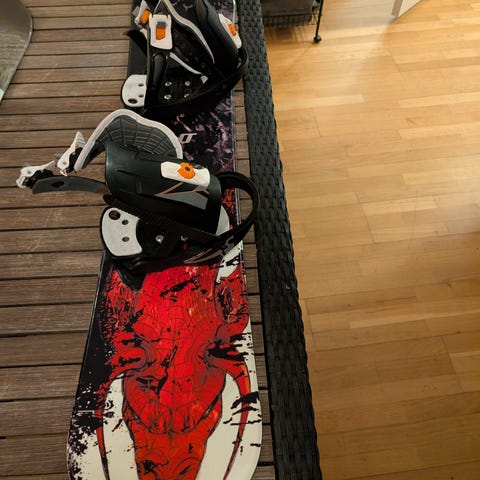 RIDE Sonik snowboard med tilhørende bindinger. Brettet har en flerfarget design med oransje, gult og svart mønster. Pluss Bindinger.