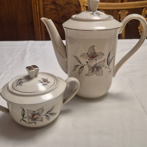 Sett med seks kopper og tilhørende tefat fra Porsgrund porselen. Tre med lilla dekor, og tre med orange. Stemplet med SP (sanitærporselen), et stempel benyttet i perioden mellom 1948-1952. Settet er i veldig god stand med ingen/minimal slitasje på gulldekoren.