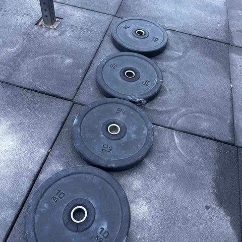 Selger et sett med bumper plates av høy kvalitet. Skivene er i veldig god stand og ser nesten nye ut. Dette er solide gummiskiver som er laget for å tåle tøff bruk og fall uten å skade underlaget eller bråke unødig.