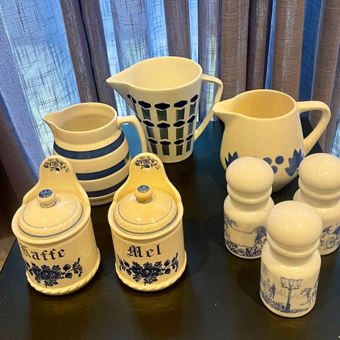 Flott vintage kjøkkensett med krukke og oppheng. Kjøpt på Brødrene Pedersen.