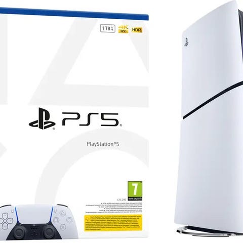 Playstation 5 spillkonsoll med moderne design og høy ytelse. Konsollen har svart og hvit fargekombinasjon og inkluderer en trådløs kontroller.