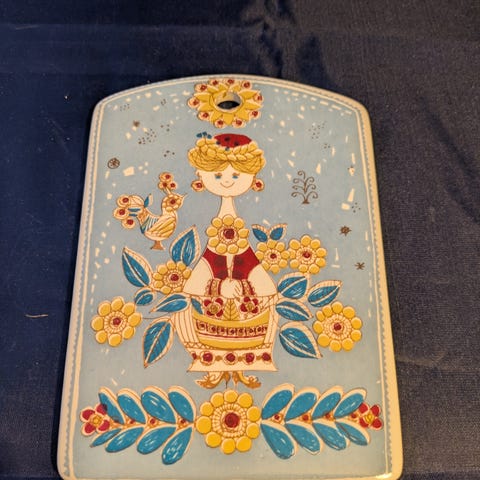 Dette er de kjente motivene av Mons (med fisk) og Mille (med kurv). Brikkene er i eksepsjonelt god stand. Glasuren er blank, glatt og helt uten krakeleringer, nagg eller slitasje i dekoren. Kun merke etter støtter under etter brenning. (Se bilder)