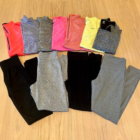 Treningsklær selges samlet. Nb hvit zip er solgt. Svart tshorte i str XS, resten i S.