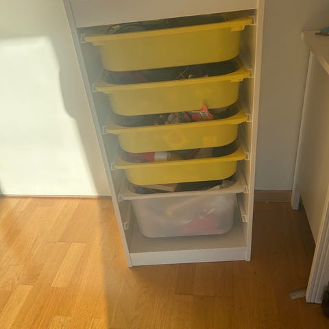 IKEA oppbevaringsenhet med flere nivåer, utstyrt med plastbokser.