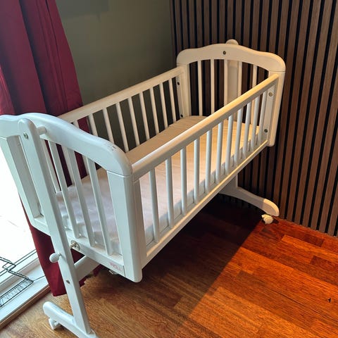 Troll Vugge vugge/barneseng i hvit. Pent brukt. Kjekk å ha de første månedene. Meiene kan tas av.