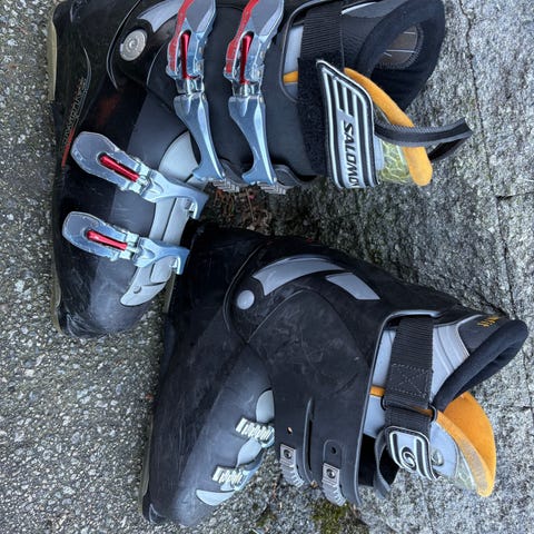 Salomon alpinstøvler/slalomstøvler str. 24-24,5 selges. Sålestørrelse 287mm. Støvlene er godt brukt, men har mange turer i bakken igjen.