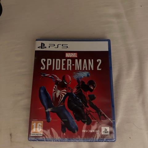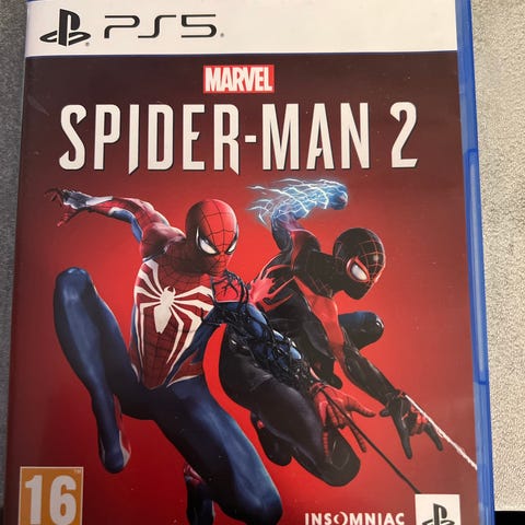Marvel Spider-Man 2 PlayStation 5 spill. Action-eventyrspill utviklet for PlayStation 5, med aldersgrense 16 år. Inkluderer karakterer og handling fra Spider-Man universet.