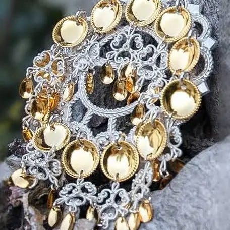 Vakker sølje i hvitt sølv, og blanke forgylte hengende løv. Denne søljen blir ofte brukt til Sunnmørsbunaden. Bredde 44mm, høyde 55 mm.