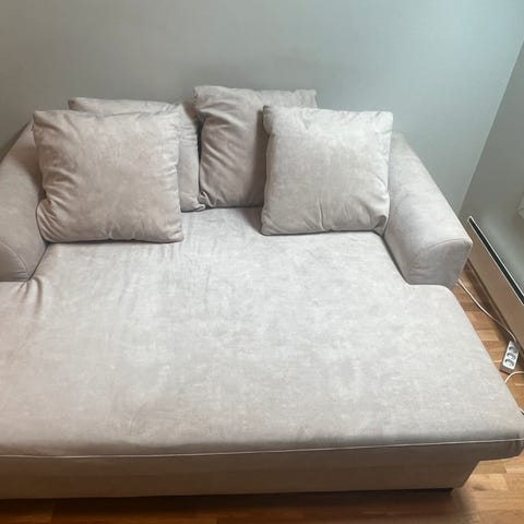 Pent brukt daybed fra Fagmøbler. Cirka 4 år gammel, noe normal slitasje på baksiden etter å ha stått inntil vegg. Kommer fra et hjem med hund. Sofaen er støvsugd, og trekket er vasket.