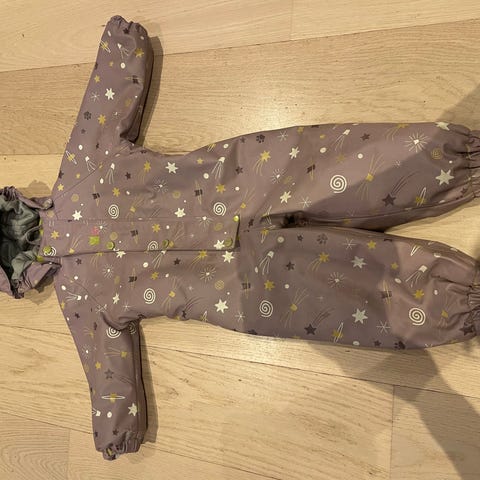 Litt slitt i rompa (ikke hull) og et par små hull langs sømmene. Kan enkelt fikses med reparasjonslapp for ytterklær.