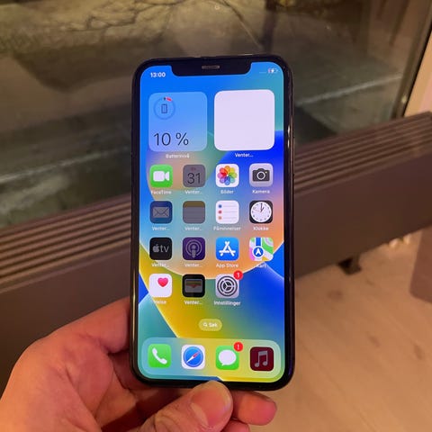 Selger en pent brukt Apple iPhone 13 med 128 GB i blå. Selges med praktisk lommebok cover.