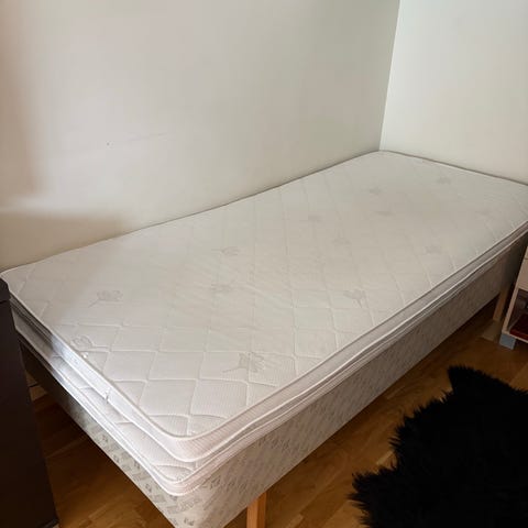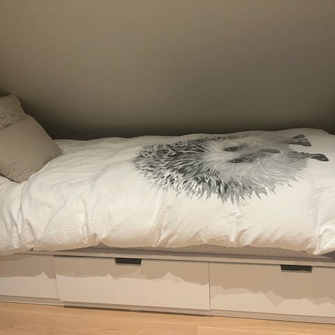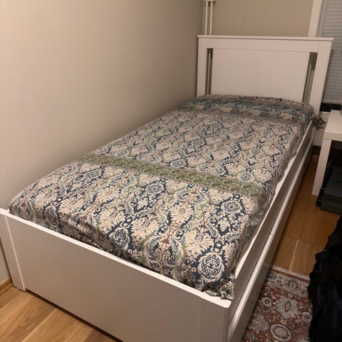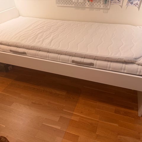 IKEA hodegavl i hvit farge med innebygde hyller på siden. Sengestammen har mål på 186 cm i bredde, 78 cm i høyde og 20 cm i dybde.