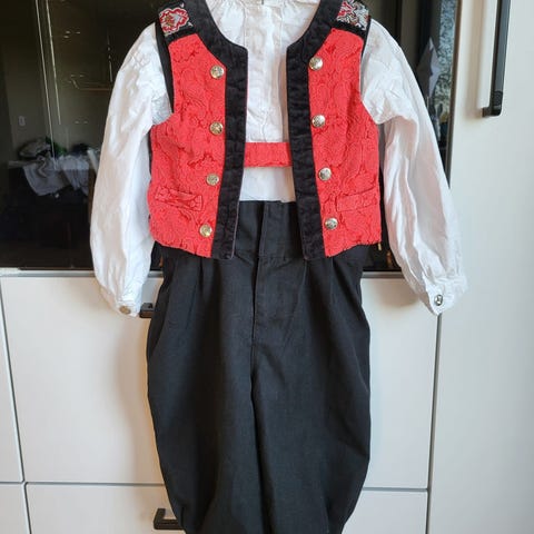 Bunad kun brukt en gang. Buksen er str 92, mens resten er str 98. Vi har brukt denne når gutten vår var str 98, da buksen er romslig i str. Kan nok også passe str 92, det kommer nok an på barnet.