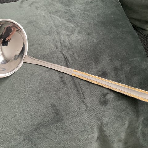 Suppeøse i rustfritt stål. Er blank, og kan se utsom sølv.