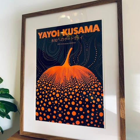 Yayoi Kusama Tokyo 1998 kunstplakat med rød prikket design. Plakaten har et grafisk mønster og er innrammet.