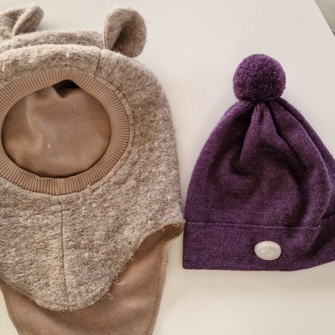 3 gode luer fra Lillelam og Huttelihut. Lite hull bak på balaclava fra Huttelihut, og noe slitasje foran, som vist på bilder. Ellers ingen feil eller mangler. Rene og pene, fra røyk-og dyrefritt hjem.