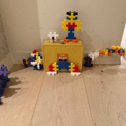Selger en liten koffert med PlusPlus. Kofferten er ganske medtatt.