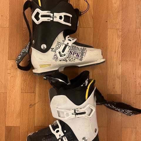 Salomon skistøvler i størrelse 27med fire spenner og justerbar stropp. Støvlene er svarte med grå og røde detaljer, laget for alpint bruk.