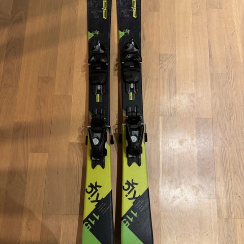 Elan Kick 35 alpinski med integrerte bindinger. Dette er twintip ski 134 cm. Passer barn 10 til 13 år. Skiene er håndlaget i de slovenske alpene og har en svart og oransje farge. Egnet for bruk på preparerte løyper og variert terreng. Litt riper på oversiden og undersiden, men har mange turer igjen før det er boss.