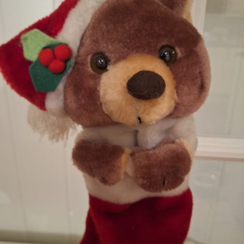 Julestrømpe bamse fra 90 tallet. I god stand, men kan godt vaskes. Ca 54 cm lang.