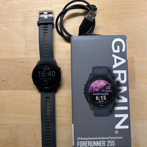 Garmin Forerunner 255 GPS-klokke i svart farge. Klokken har en rund urskive og leveres med ladekabel og bruksanvisninger. Egnet for bruk ved trening og daglig aktivitetsovervåkning. Kjøpt for sommeren 2024. Selges fordi jeg aldri begynte å bruke den.