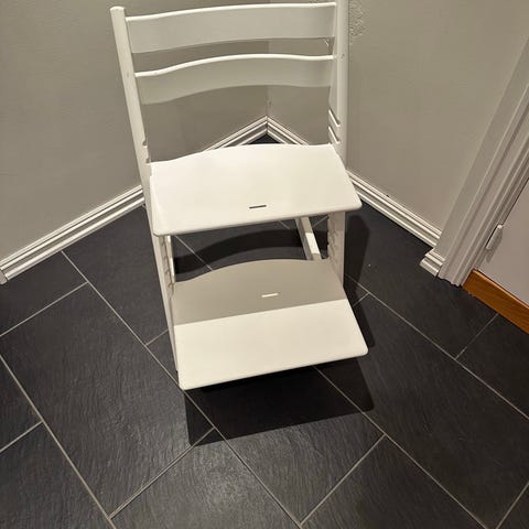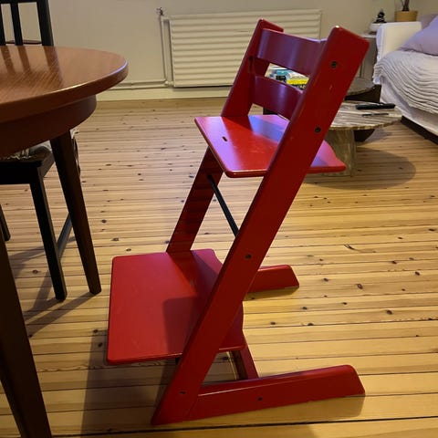 Kan leveres til Stjørdal og Trondheim . Stokke barnestol i tre med avtagbar pute. Justerbar sitte- og fotplate for tilpasning til barnets vekst. Designet for bruk til barn ved spisebord eller som stol for små barn.