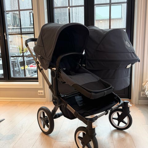 Bugaboo Donkey 5 Tvillingvogn i grønn farge. Vognen er designet for to barn med separate seter, hver med justerbare seler og kalesjer. Den har et robust understell med store hjul for god fremkommelighet. Kommer med 2 bagdeler og 2 sportsdeler, samt regntrekk og veske til håndtaket. Må hentes. Alltid oppbevart innendørs og ikke brukt i barnehage. Svært små riper på siden som vises på de to siste bildene, generelt veldig pent brukt!