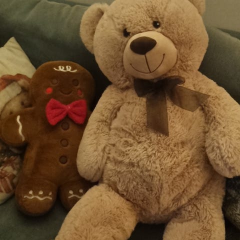 Stor og myk bamse som har vært til pynt på soverom. Lys brun farge med mørkere detaljer på poter og snute. 150 cm høy. Mykt materiale egnet for barn. Passer som leke eller dekorasjon i barnerom.