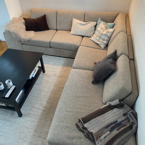 Hjørnesofa i grått stoff. Sofaen har en moderne design med justerbare hodestøtter og gir plass til flere personer. Egnet for stue eller oppholdsrom. 5 år gammel, men pent brukt. Må hentes.