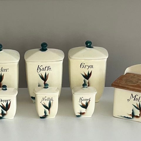 Dekorativ og praktisk veggkrukke med trelokk i norsk retrodesign fra 1970 tallet til kaffe, salt eller sukker. Pen brukt stand, normal aldersslitasje.