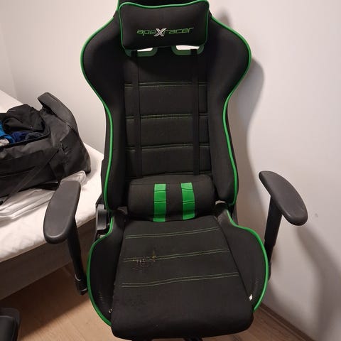 Beige komfortabel stol med brune treføtter. Synlige flekker på deler av stolen, ellers ingen hull eller annen skade. Dyprens eller nytt trekk vil nok gi stolen et løft. Pen fasong på stolen. NB! Corgi følger ikke med :-)