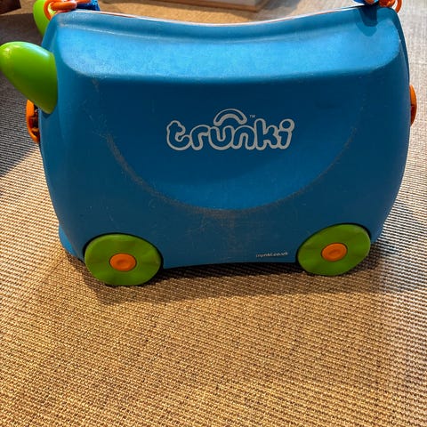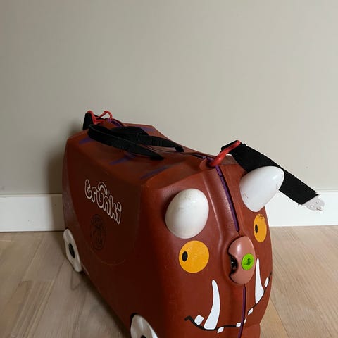 Selger en Gruffalo Trunki barnetrillekoffert. Den har synlige bruksmerker på yttersiden, men hjulene fungerer akkurat som de skal. Det følger med en stropp, slik at barnet kan trekke den selv/bli dratt mens barnet sitter på kofferten.