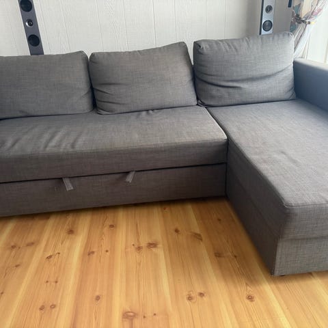 Helt fin sovesofa med oppbevaring i sjeselongen selges til høystbydende over 300kr. Det er fortsatt mye bruk igjen. Vanlig bruksslitasje, et par malingsflekker og noen flekker etter fjæringen på den delen en drar ut. Ellers fin og grei. Må hentes raskt.