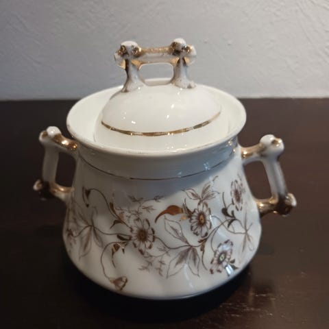 Selger en vakkert, gammel serveringsbolle fra Limoges i Frankrike. Det antikke fatet er i koboltblått og har blomsterdekor og gulldekor. Bollen er uten skader og i god stand, og har for det meste stått til pynt.