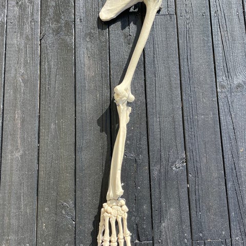 Anatomisk skjelettmodell laget av tre og plast. Modellen viser menneskets skjelettstruktur med detaljerte ben og ledd. Egnet for undervisning og demonstrasjon av menneskelig anatomi. Har selv brukt den til Halloween og dekorasjon. Den mangler en del deler, men er ellers i grei stand. Må hentes i Ås.