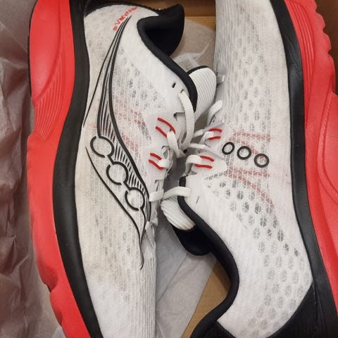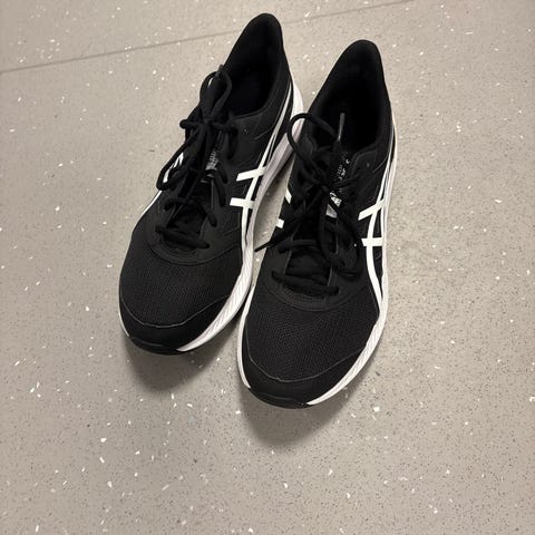 Asics løpesko i størrelse 45 med hvit og svart/rød farge. Skoene er designet for løping og har en mesh-overdel for pusteevne og gummisåle for godt grep.