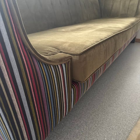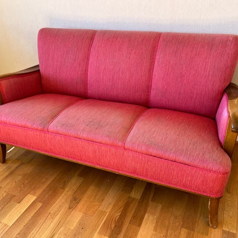 En vintage sofa med vakker blåfarge selges. Denne nydelige sofaen er for deg som liker møbler med historie. I motsetning til IKEAs rette kanter. Sofaen er godt brukt, og det vises i form av naturlig patina i stoffet og små spor av et levd liv. Nettopp dette gir den karakter, varme og en autentisk vintage-følelse som er vanskelig å gjenskape i nye møbler. Flotte detaljer og stødig treverk holder den solid til mange generasjoner som kommer. Må hentes.