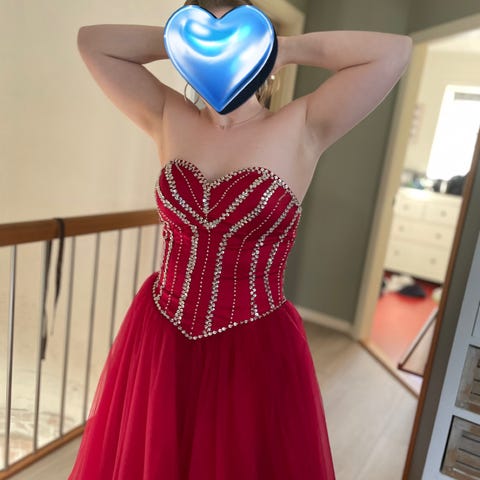 Kjolen er litt møkkete nederst på kanten på undersiden av det innerste skjørtet pga subbing ned på gulvet, og den har noen selvbruningsflekker i overdelen - dette er ikke synlig når kjolen er på.