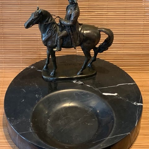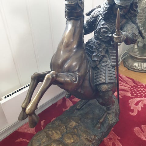 Skulpturen er laget i bronse og har detaljerte elementer som klær og hestens man. Passer til dekorasjon eller samling av kunstgjenstander.