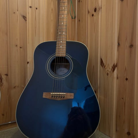 Akustisk gitar med cutaway i solfarge. Gitaren har fem strenger en må settes, gripebrett med båndmarkeringer og en tradisjonell lydhullring. Den er egnet for akustisk spilling og har en kropp som gjør det mulig å spille nær båndene takket være cutaway-design.