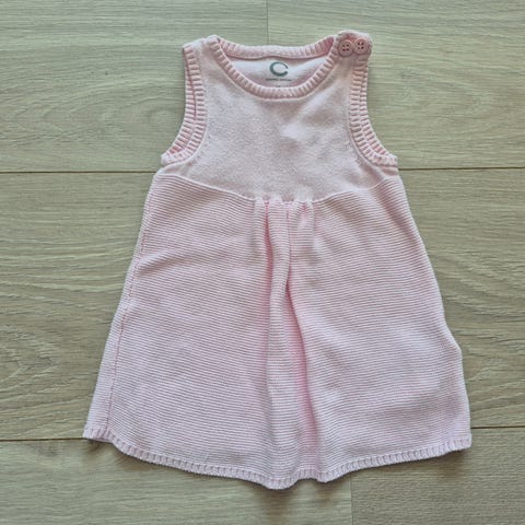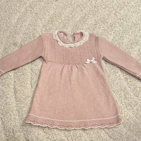Nydelig kjole til baby i merinoull, fra det norske merket Mole. Pent flettemønster på bolen og ermene. Knepping på skudrene. Fargen er ikke helt riktig på bildet. Den er mer pudder rosa.