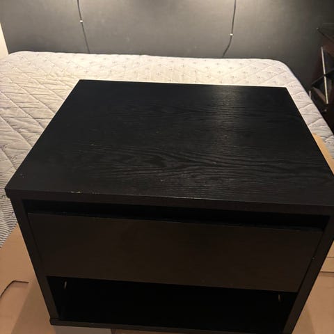 Hvit nattbord med to skuffer. Møbelet har en enkel, rektangulær form og glatt overflate. Skuffene gir oppbevaringsplass til for eksempel bøker, elektronikk eller småting ved siden av seng eller sofa. Passer som nattbord på soverom eller som liten oppbevaringskommode i andre rom.