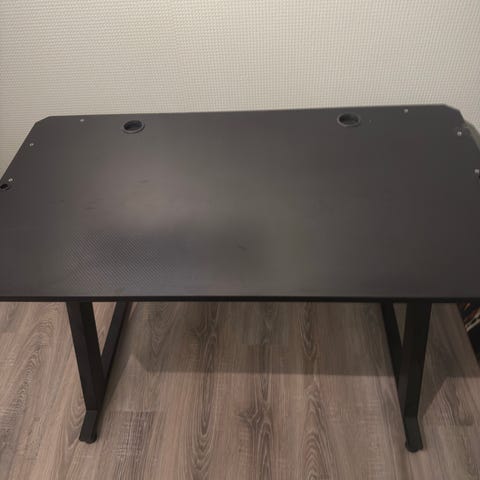 Gamingbord med blått LED-lys og mindre bord å ha oppå til skjerm.