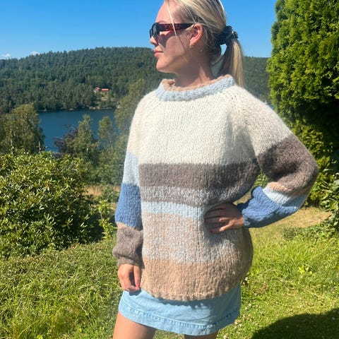 Coraline genser i størrelse XS/S, strikket med 1 tråd Alpakka Magic fra Dale garn. Genseren er lite brukt. Garnet koster 110 kr per nøste. Det ble brukt 9 nøster i genseren.