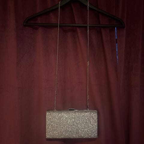 Liten clutch kledd i paljetter, sølv, med skulderreim i kjetting, magnetlås.