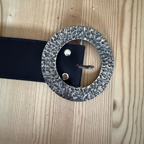 Skinnbelte i svart farge med en dekorativ metallspenne (messing?)