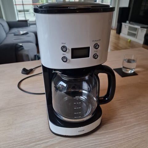 Melitta kaffetrakter med hvit plastkropp og glasskanne. Designet for å brygge kaffe med enkel bruk. Utstyrt med avtakbar filterholder og dryppstoppfunksjon. Passer til hjemmebruk.