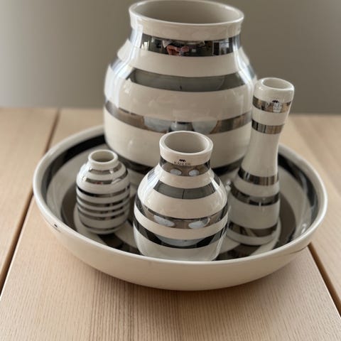 Kähler, sagaform og Wik å Valsø dekorasjonsornamenter i keramikk, inkludert flere vaser og en tallerken med et rødt ekorn som dekorasjon. Produktene har ulike mønstre som striper og dyremotiv i sort, hvitt, grønt og rosa farger.